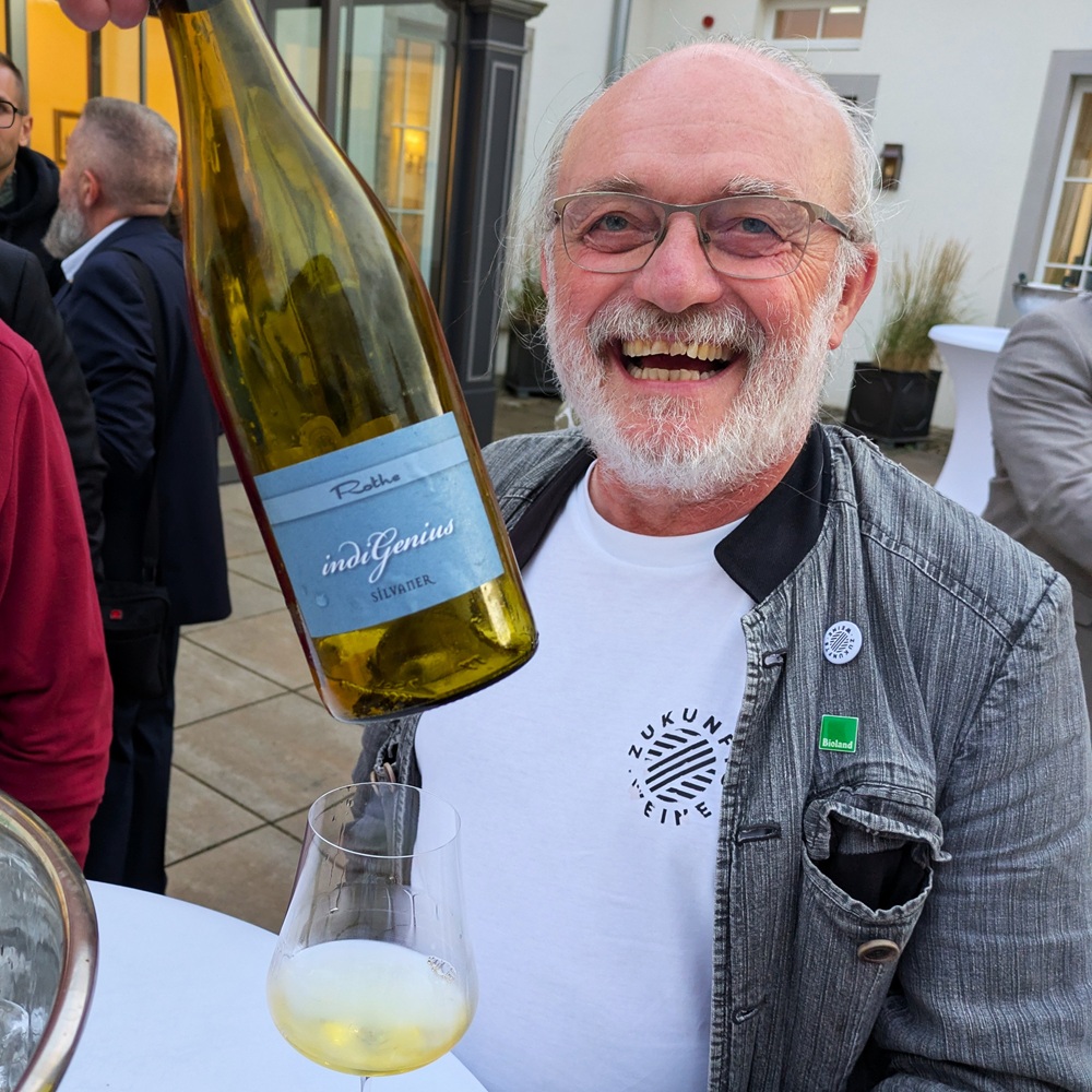 Oben seht ihr Manfred Rothe ziemlich happy und, wie er mir sagte, auch wirklich berührt. Vorher wurde bekanntgegeben, dass in der Kategorie »Außer…gewöhnlich« Platz 3 an Manfred Rothe, Platz 2 an Manfred Rothe und Platz 1 an Manfred Rothe ging. Indigenius vor zweimal Kvevri aus unterschiedlichen Jahrgängen. Die Gemeinde tobte. Und glaubt mir, es wurden nicht etwa nur drei Weine getestet, sondern (weiß ich dank Bodo mittlerweile) 16. Aber Manfred ist halt der Beweis dafür, dass man in der dieser winzerisch wirklich enorm anspruchsvollen Naturwein-Kategorie mit Herzblut, Aufmerksamkeit, viel Erfahrung und Durchhaltevermögen große Weine kreieren kann. Ein Ansporn für andere.