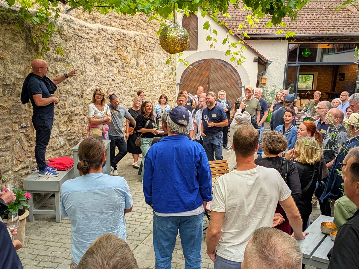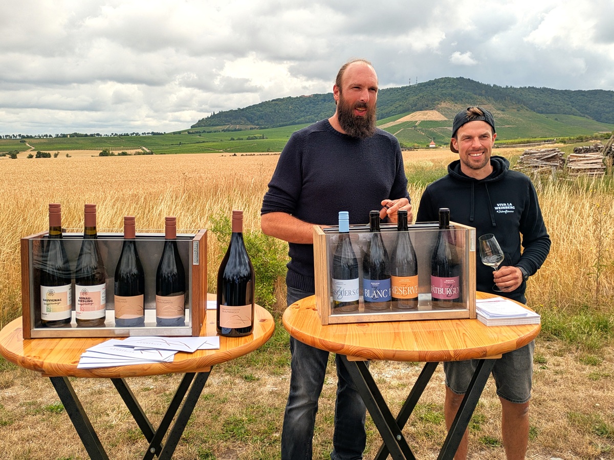 Teile der Jury erschienen am nächsten Tag ziemlich gerädert. Da passte es eigentlich ganz gut, dass es in diesem Jahr zum »Best of Franken« endlich mal kühler und schattiger war. Der Tag nach der großen Sause steht immer unter dem Motto »Exkursionen«. So ging es diesmal zu den Weingütern Hemberger und Drei Zeilen (oben Christian Ehrlich und Tobi Hemberger), später noch zu Brennfleck und Luckert, und Weine von Martin Hirsch gab es auch. Natürlich weinten alle, als sie wieder auseinandergehen mussten, aber Hoffnung liegt in der Gewissheit, sich nächstes Jahr in ganz ähnlicher Runde wiedersehen zu können.