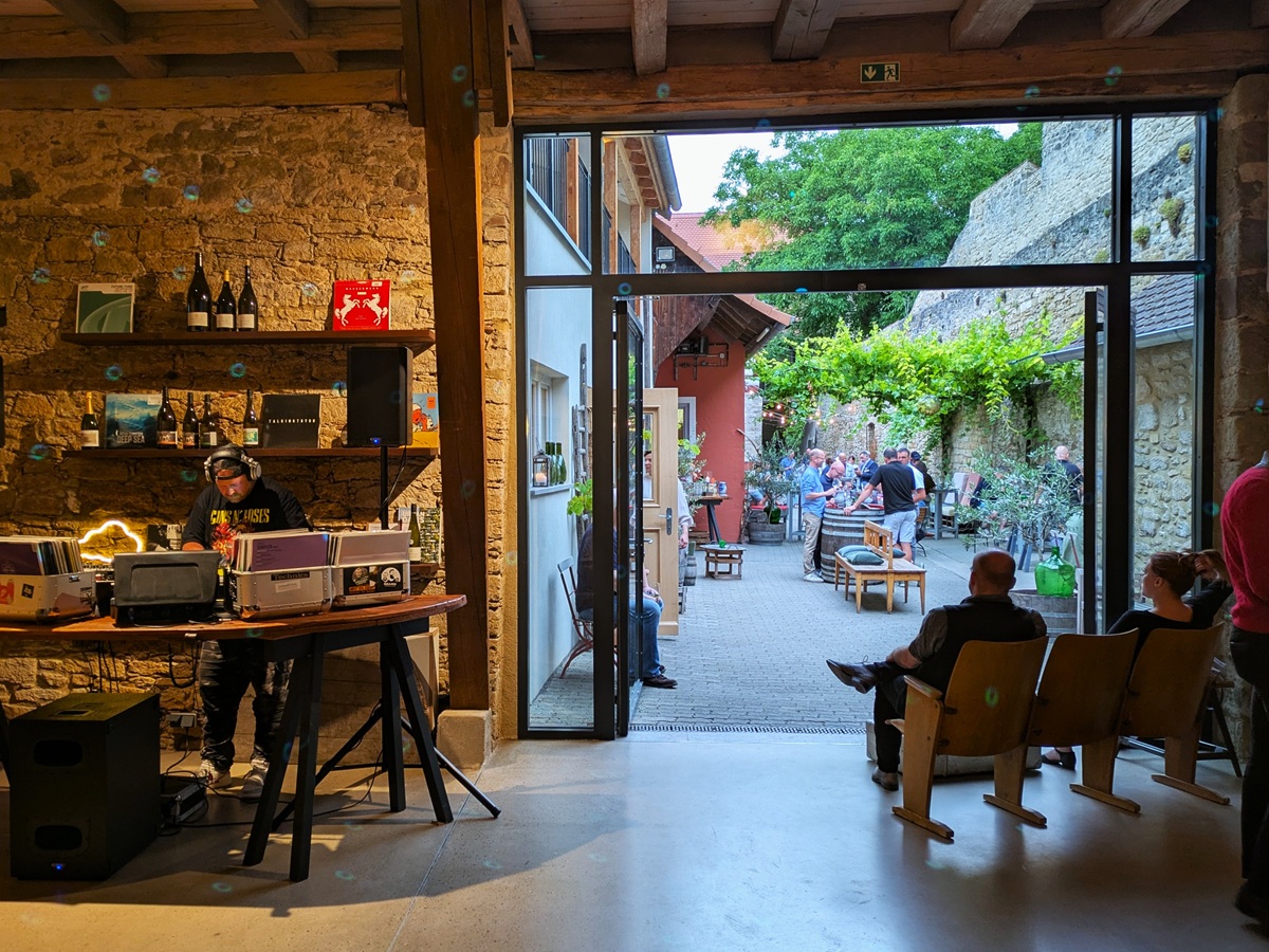 Zweiter Programmpunkt am Vortag: Treffen mit Keuper-Winzern im Weingut Ilmbacher Hof. Hausherr Thomas Fröhlich ist mittlerweile fast mehr als DJ bekannt denn als Winzer, letzteres kann er aber auch soweit ganz gut (Beweis folgt gleich). Da wir in der Jurorenschaft mit DJ Thorsten (der sicher noch einen anderen Bühnennamen besitzt) auch einen gestandenen Vinyl-Aufleger an Bord hatten, wurde für einige bereits der erste Abend ziemlich lang.