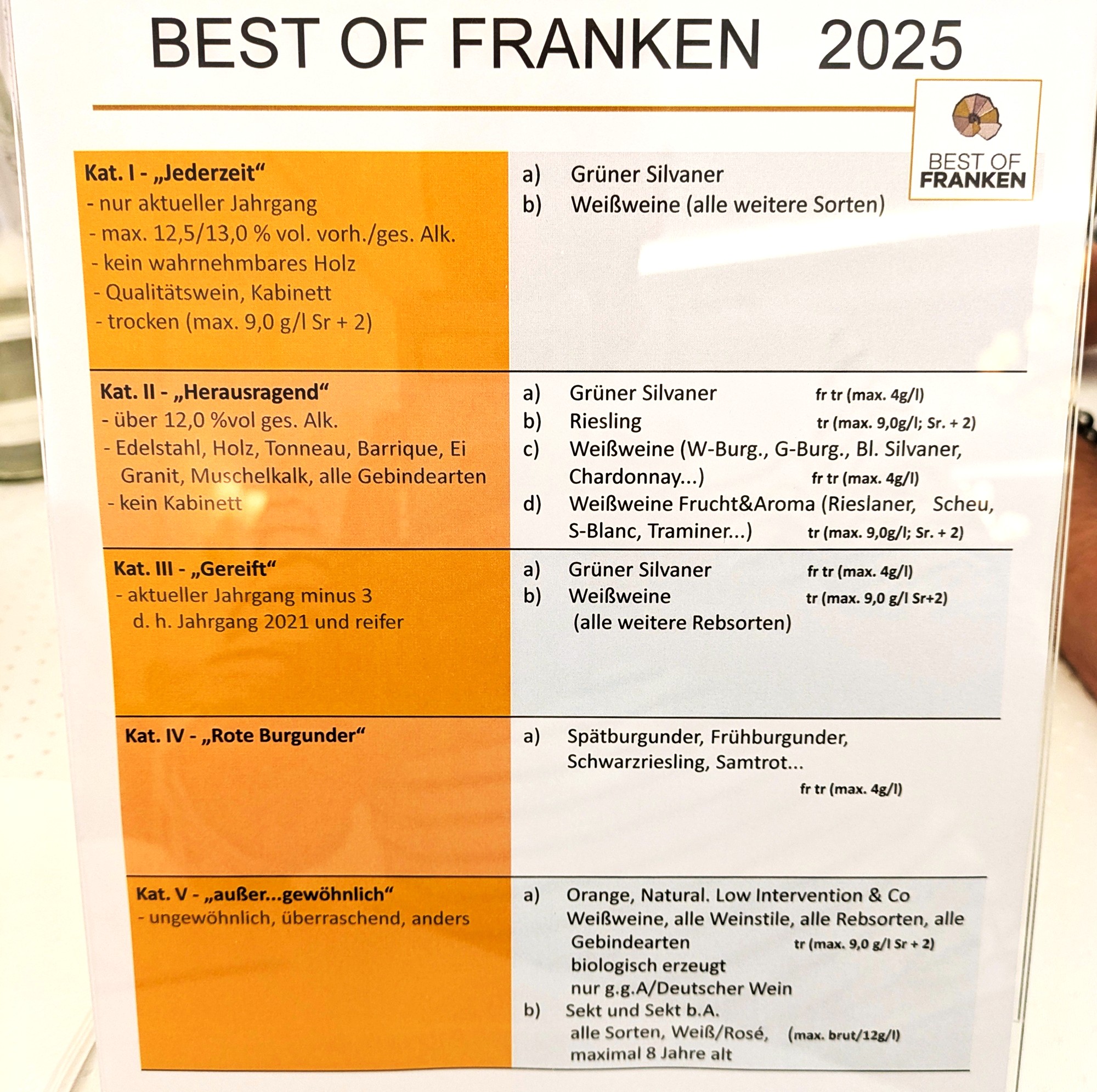 Der Tag der Entscheidungen beim »Best of Franken 2025«. Oben seht ihr die elf Kategorien und ihre Vorbedingungen. Ich selbst war in Vorrunde, Semi-Finale und Finale diesmal ausschließlich an Silvanern beteiligt. Kein Grund zum Beklagen allerdings. Erstens gab es jede Menge erfreuliche Weine zu probieren, zweitens konnten wir die anderen Siegerweine ja abends nachtesten. Nebenbei für alle, die es noch nicht wissen in der Region: Die Jury beim »Best of Franken« ist seit einigen Jahren enorm hochklassig. Da gibt es mehr Sternedekorierte als am Weihnachtsbaum. Jetzt aber zur versprochenen Transparenz, denn jede einzelne Kategorie hat ihre ganz eigenen Tücken.